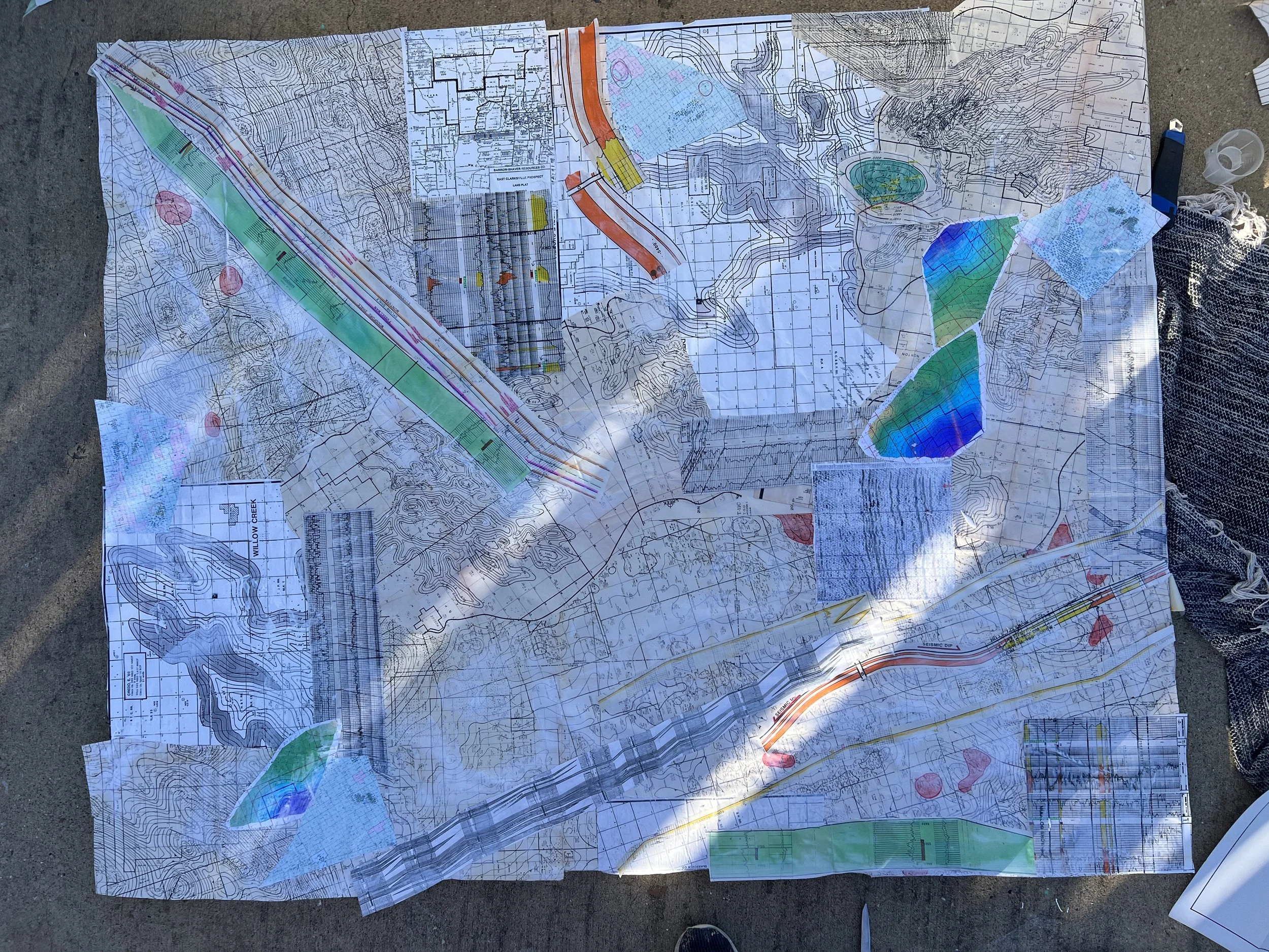The “tricky” part was making the foundation / background of the painting : which was a collage of the oil maps and charts. Again, I am looking at it as an artist, so this was an interesting challenge of combining colors, shapes, patterns, and varied shapes.