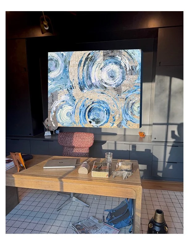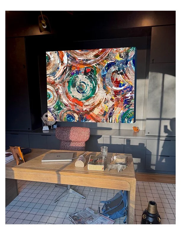 This is an important note: the first “delivery” - my client asked if we could put a high gloss varnish on the painting, which often gets decided after the piece is finished and they decide what finish they want on the piece. I had left it matte so we had a choice. High gloss was the vote, so I took it back to the studio to put down the varnish. WOW - the colors popped so well after this. Great choice.
